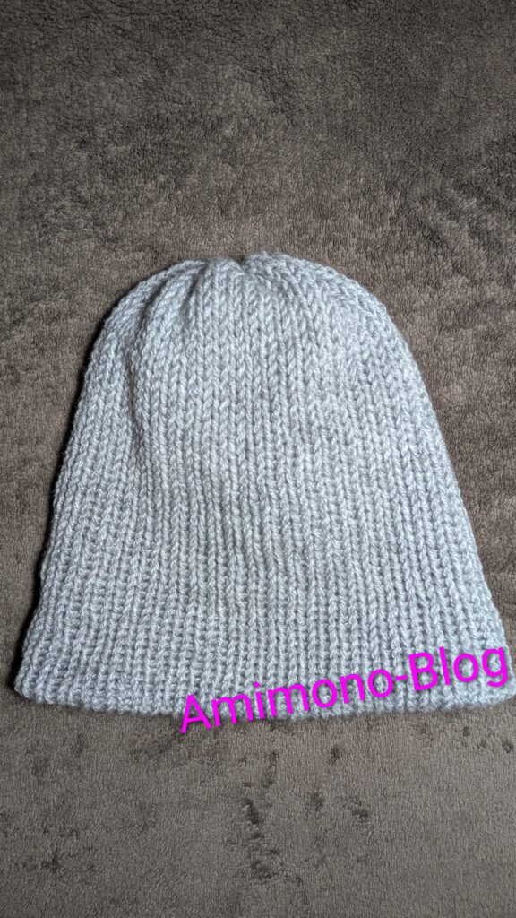 ニット帽のサイズは100段編んで真ん中で折り返して絞って閉じました。