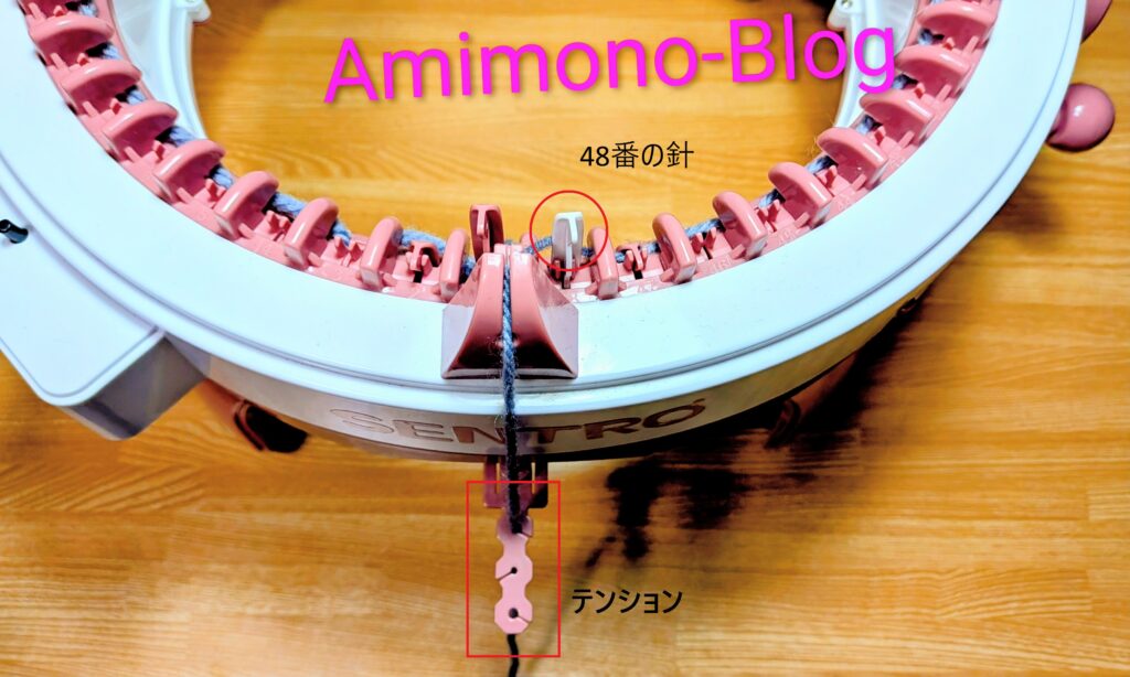 捨て糸を3段~5段編んだら糸を「テンション」と「糸ガイド」から外して、ハンドルを
