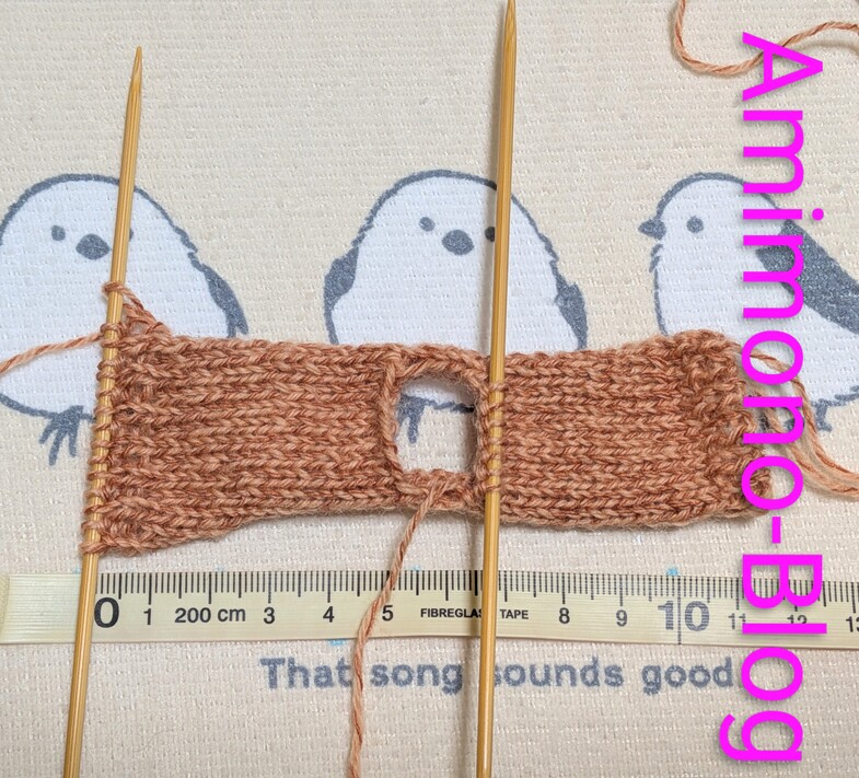 袖の目を拾って10段ほど編むとちょうどいい長さになりそうです。
